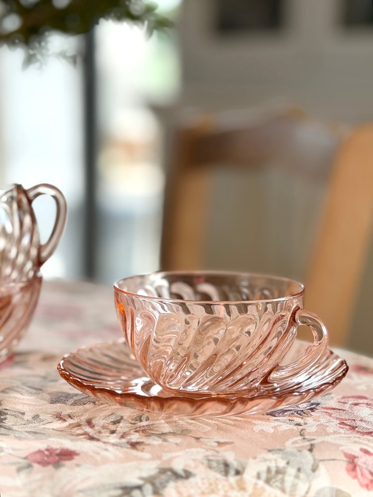 Modèle emblématique en verre pressé rose, au décor tournoyant caractéristique.