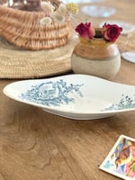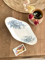 Ravier en faïence estampillé Sarreguemines Terre de fer, datant de la fin du XIXe siècle (vers 1875-1900). Son décor bleu délicat représente une scène champêtre ornée de petits oiseaux et d’arabesques florales, typiques de cette époque romantique.