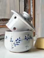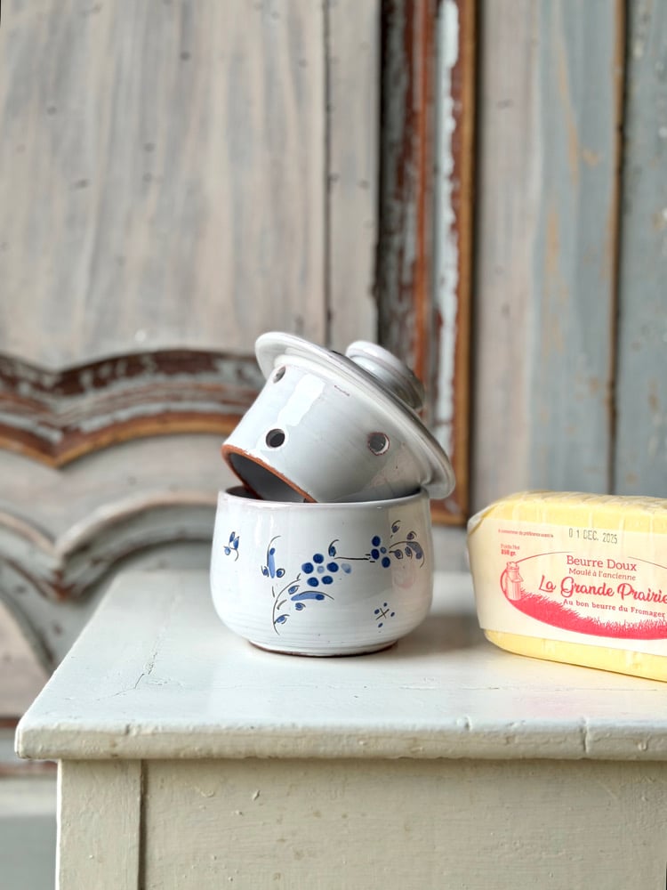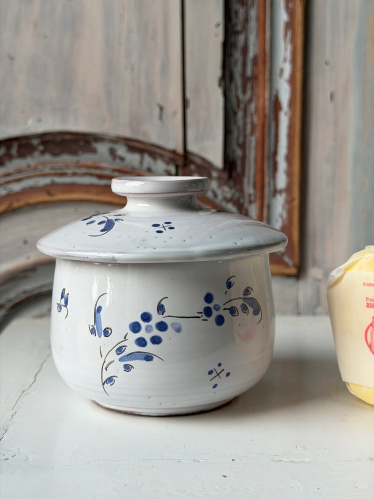 Beurrier à eau en terre cuite émaillée, signé Moustiers.