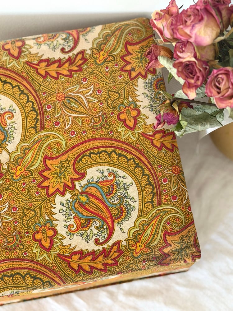Boîte ancienne en tissu XXL à décor cachemire, probablement destinée à la couture ou à la mercerie.