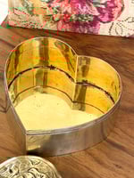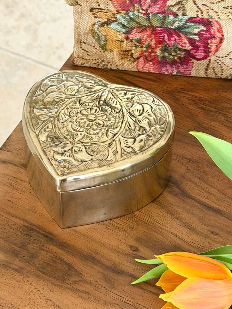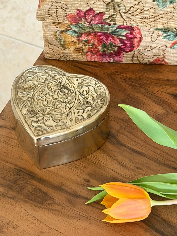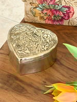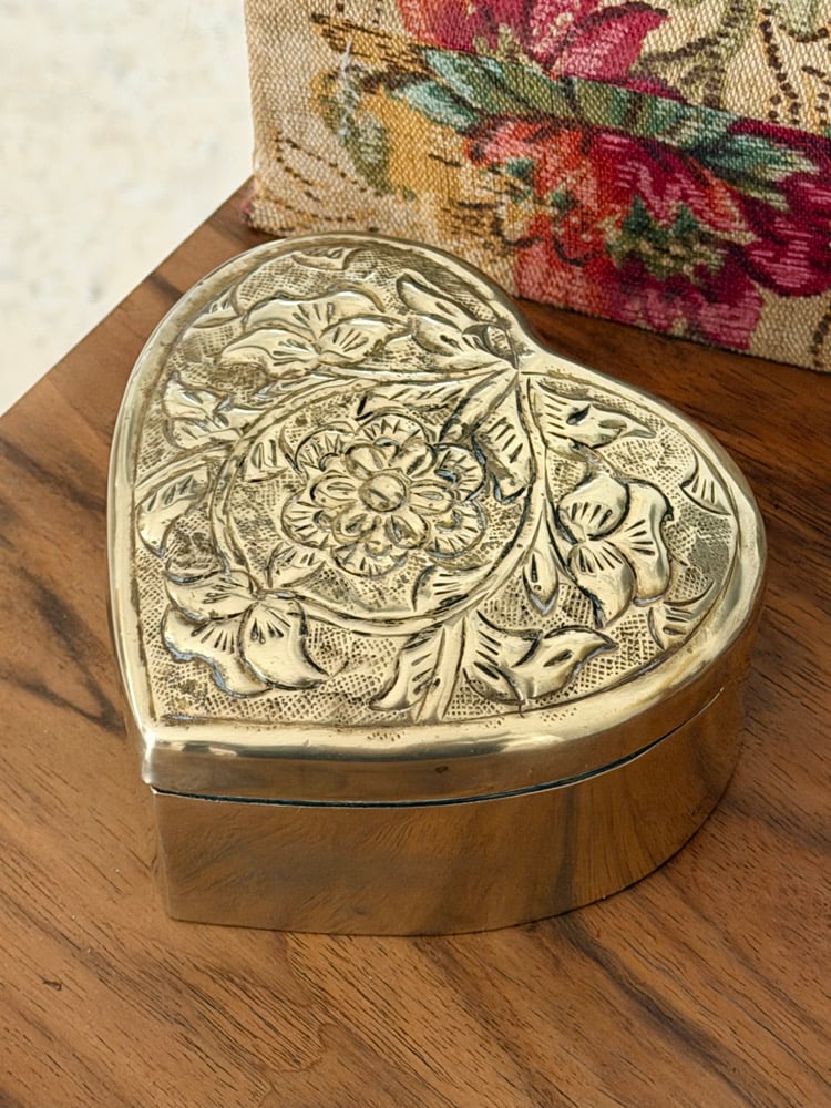 Boîte en laiton en forme de cœur, décor floral travaillé en repoussé.