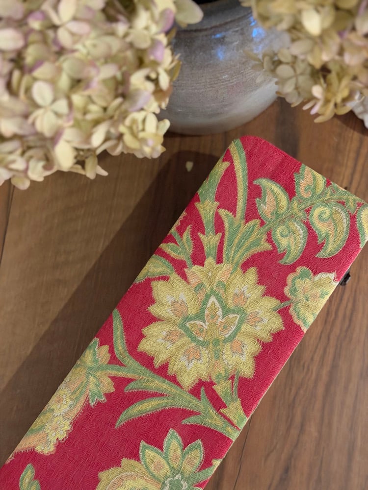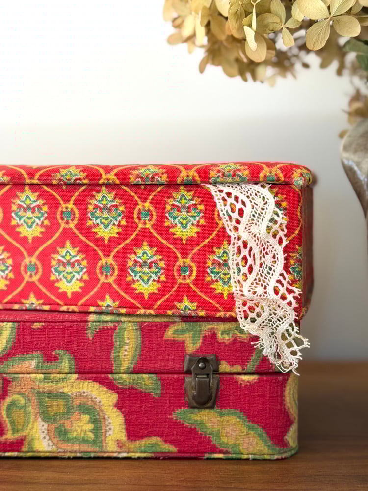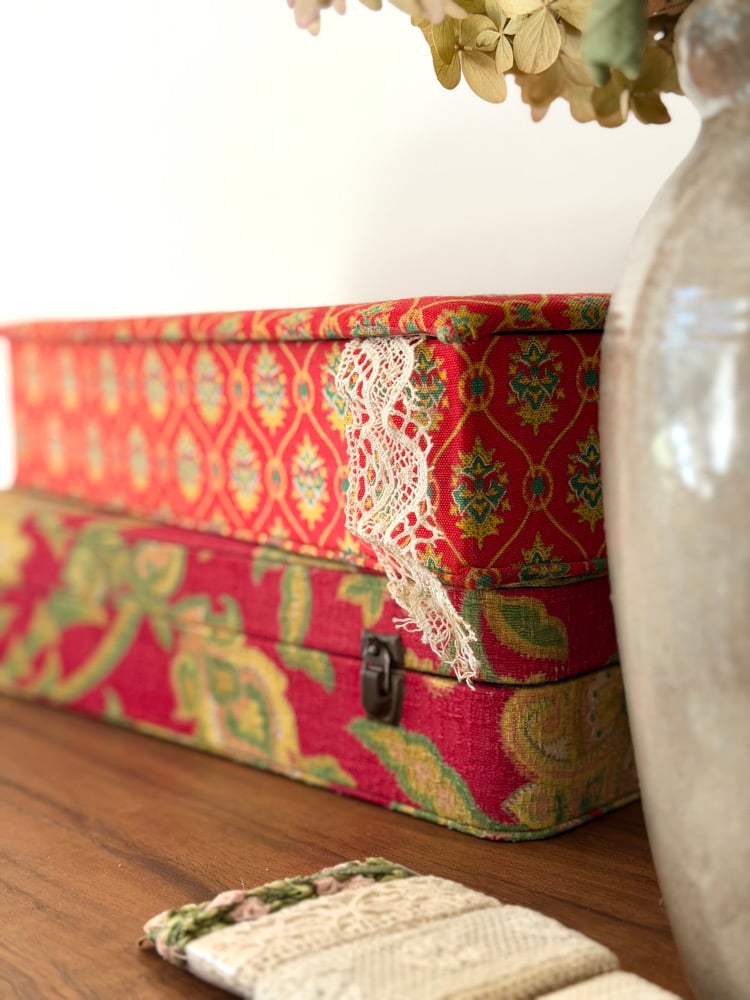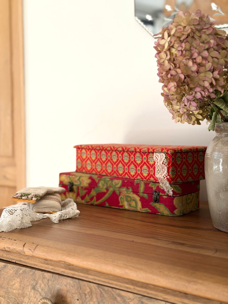 - La boîte supérieure est une ancienne boîte à couture, recouverte d’un tissu fleuri.