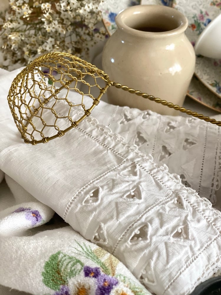 Ils sont emballés dans du linge et joliment ficelés (fleur séchée, carte ancienne, ruban).