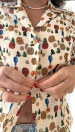 Elle est ornée d’un imprimé fantaisie coloré et de boutons dorés. La petite fente triangulaire au bas de la patte de boutonnage souligne la ligne de la chemise et apporte un joli détail de coupe.