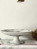 Charmant compotier ancien en faïence fine Terre de Fer, décoré du motif « Œillets » dans un bleu-vert délicat.