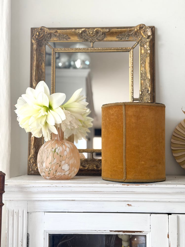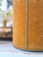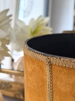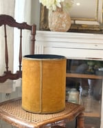 Ancienne corbeille recouverte d’un velours ocre, ornée d’un galon qui souligne sa forme et lui apporte une finition élégante.