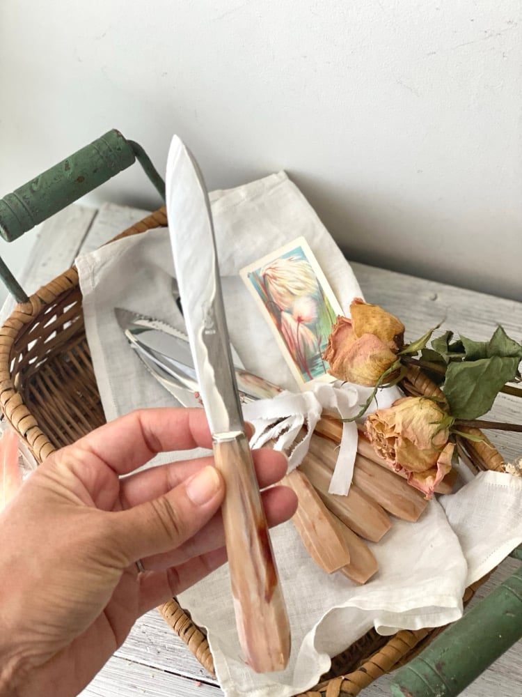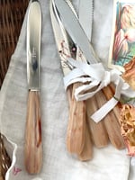 Superbe ensemble de 6 couteaux de table au style rétro, avec manches en résine marbrée façon nacre et lames en inox estampillées.