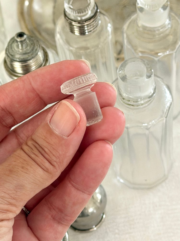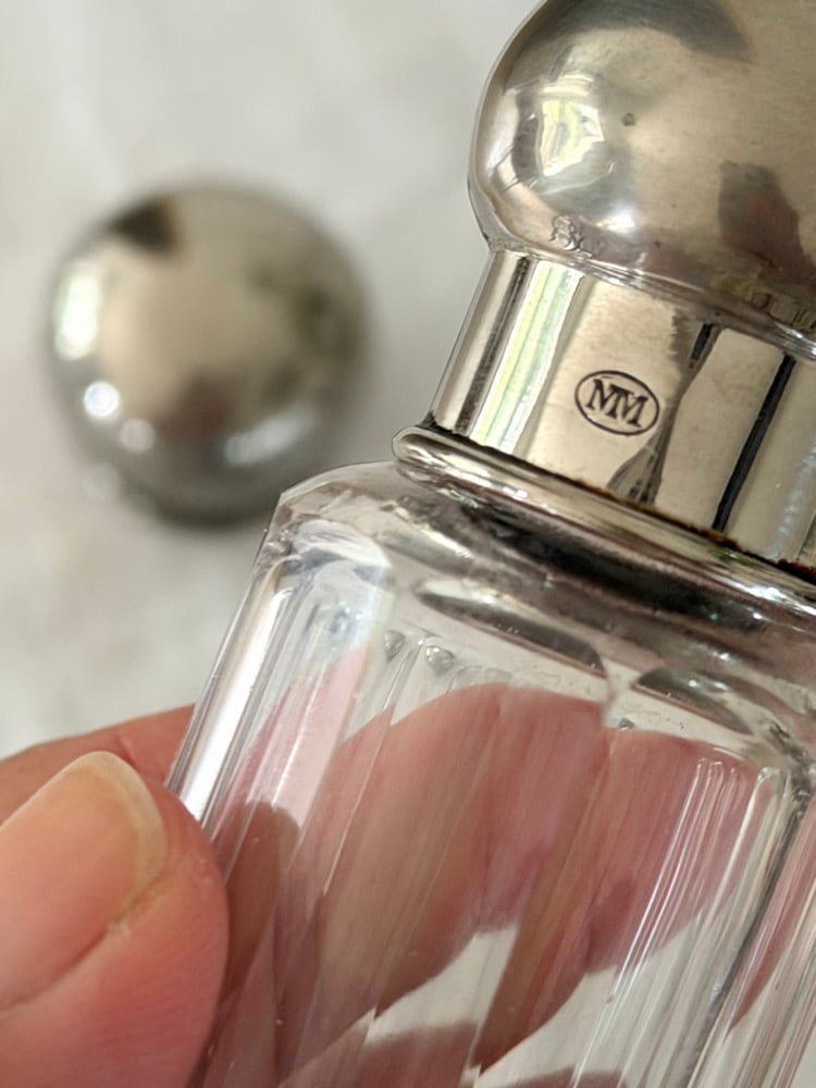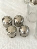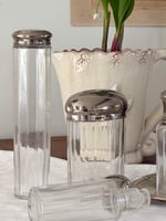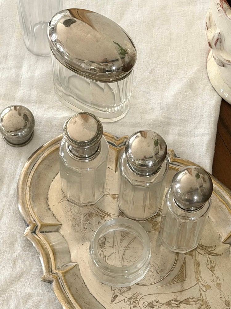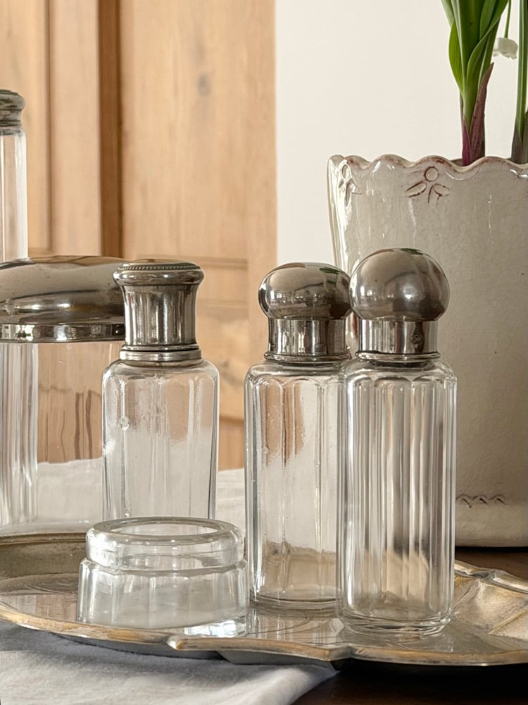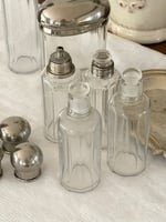 Ensemble ancien de flacons de toilette en verre facetté avec bouchons en métal argenté.
