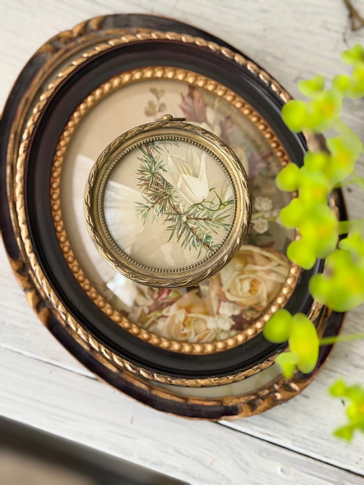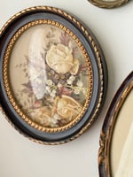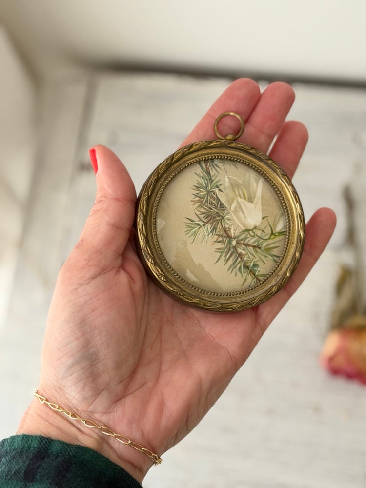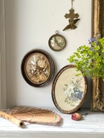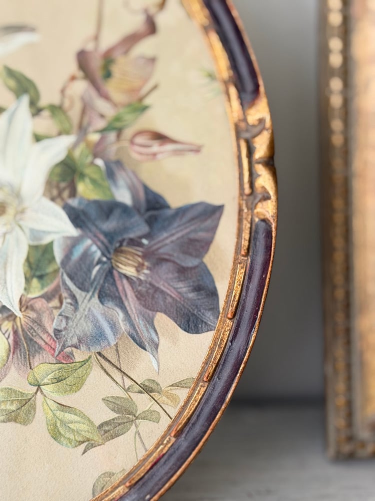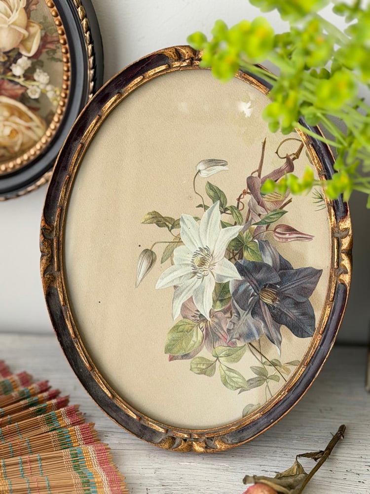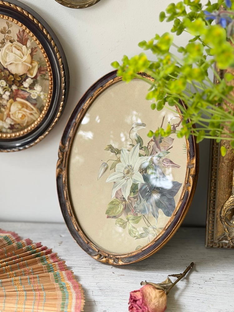 Charmant ensemble de trois cadres médaillons anciens ou vintage contenant des lithographies botaniques anciennes aux délicats motifs floraux : clématite, roses et muguet, genévrier et campanule.