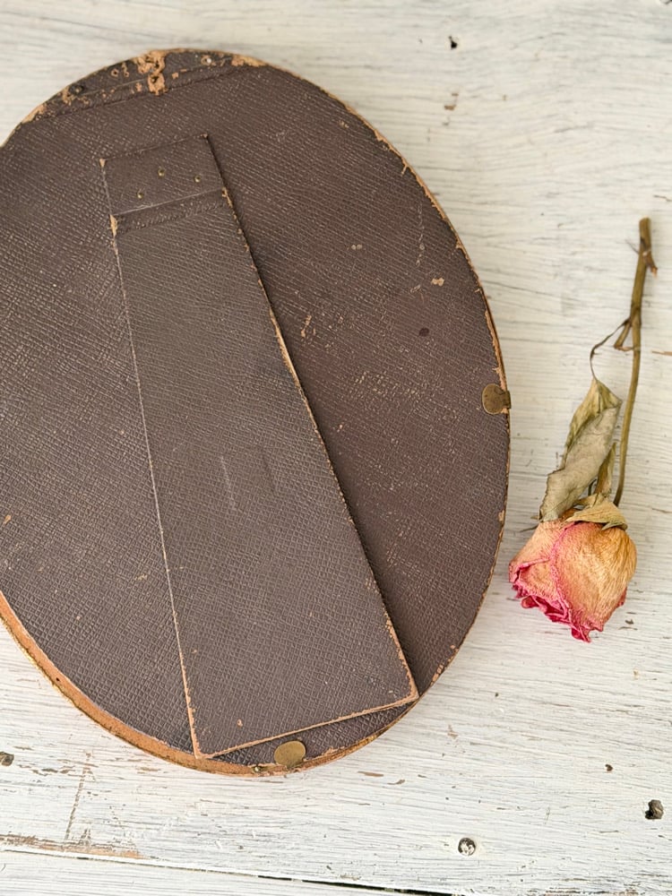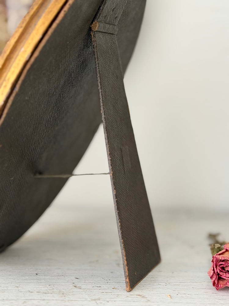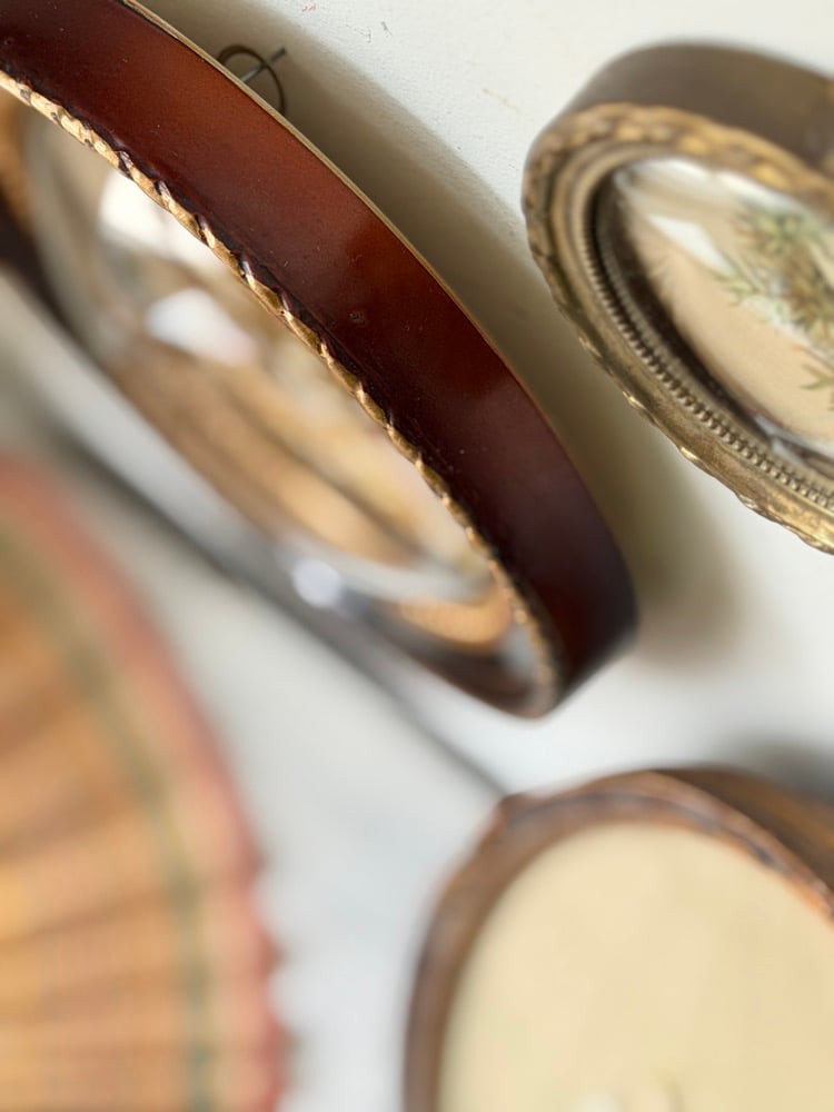 Les cadres, de forme médaillon, sont en bois, bakelite et métal patiné.