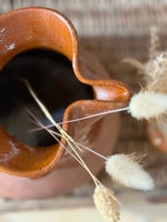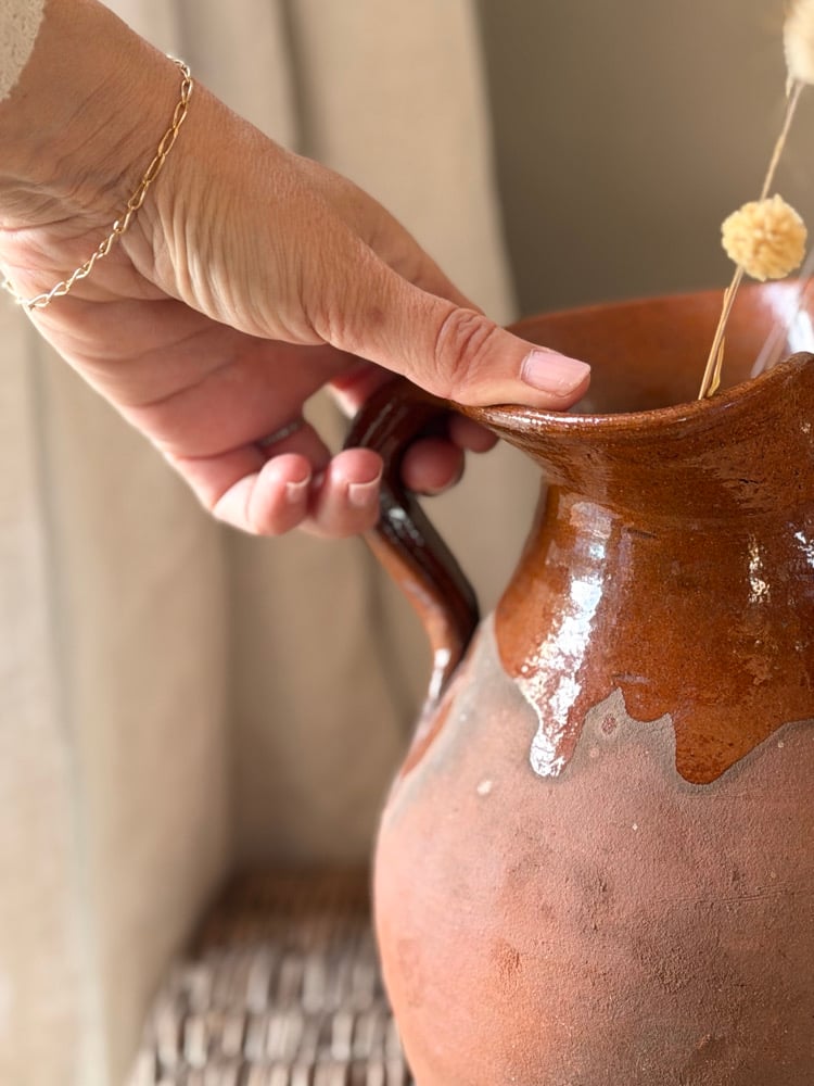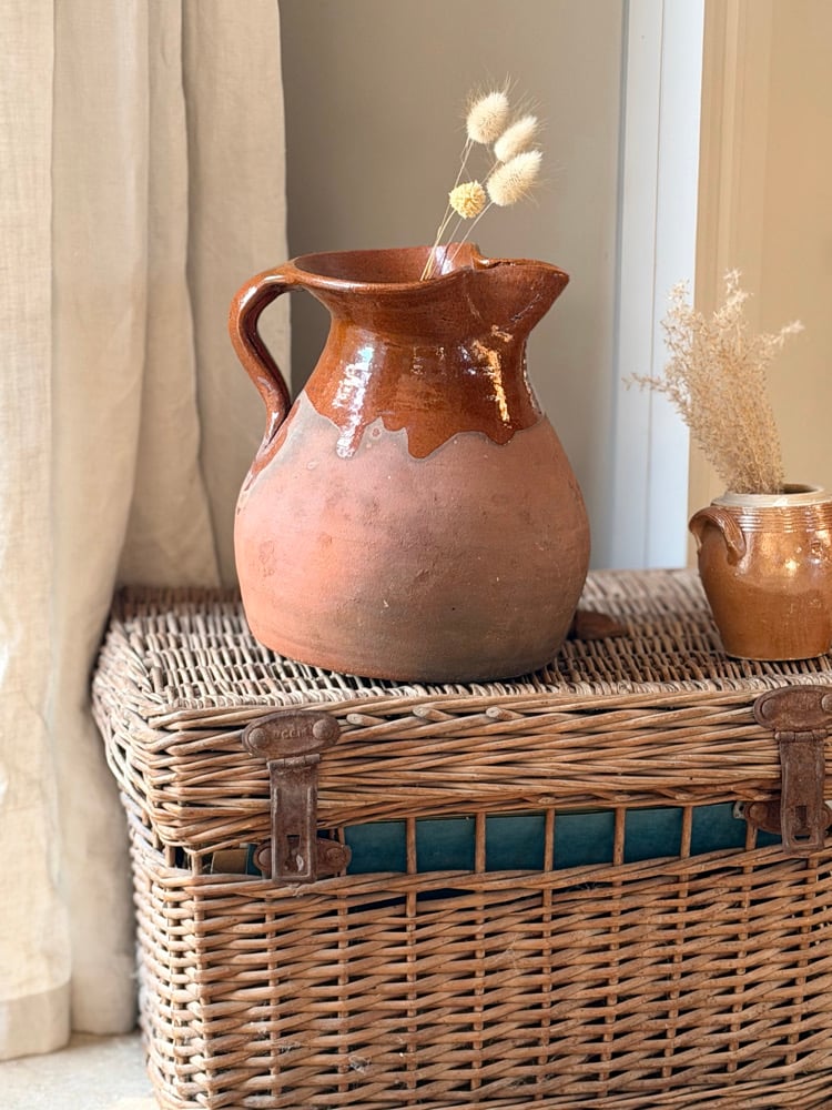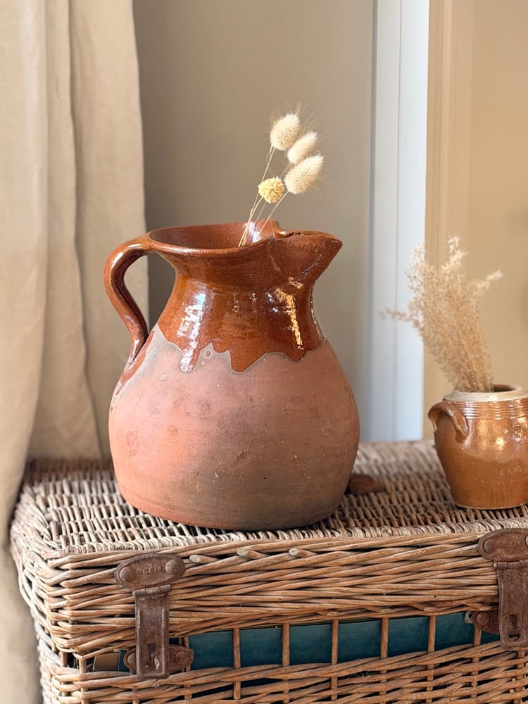 Ancien pichet en terre cuite, partiellement émaillé dans des tons bruns chaleureux.