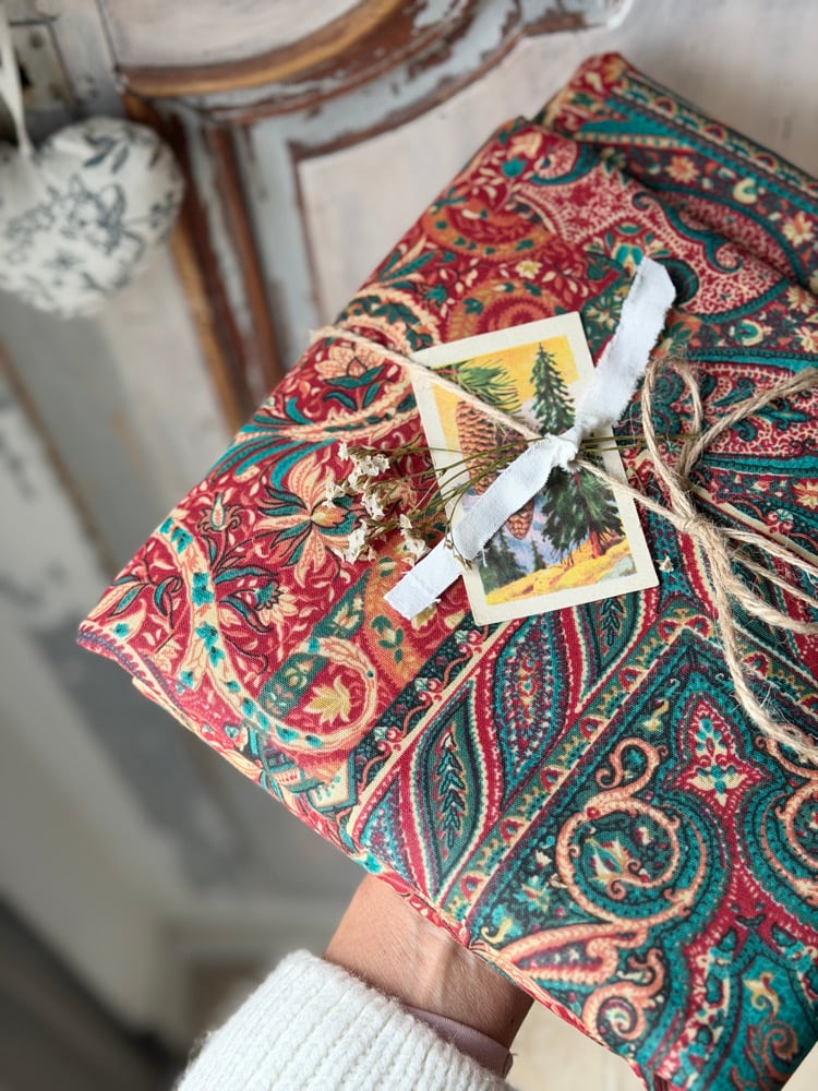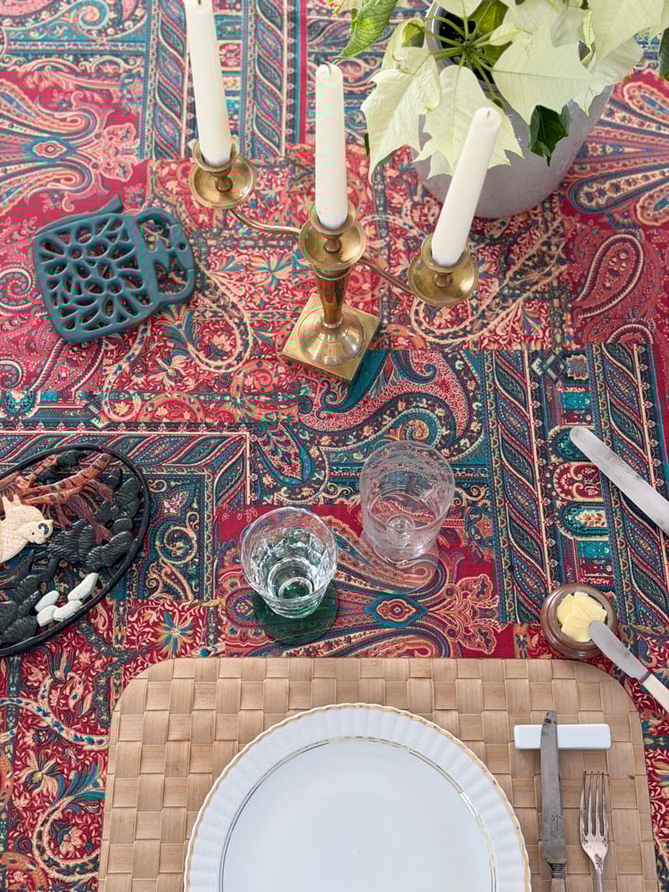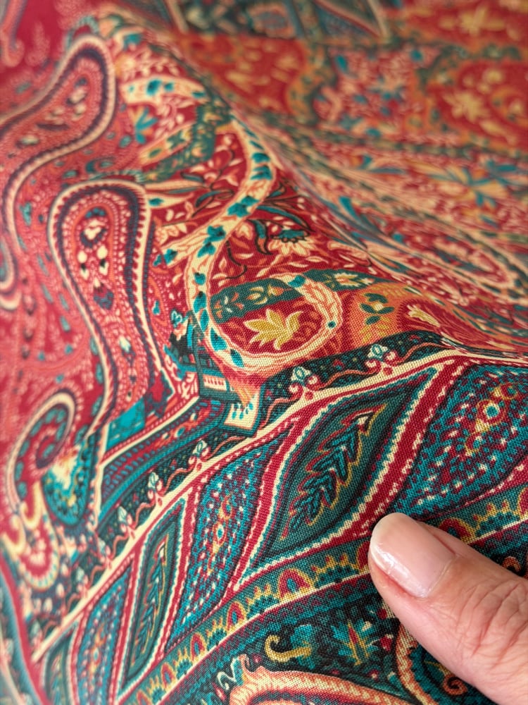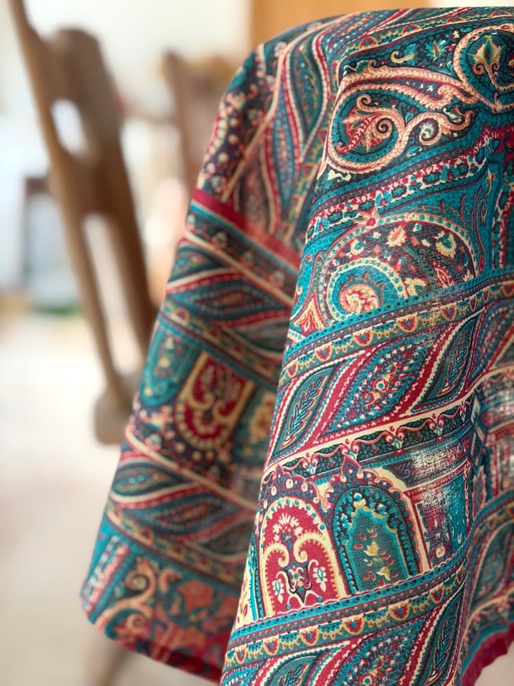 Superbe nappe vintage de la marque Damart, ornée d’un élégant motif cachemire dans des tons chauds de rouge, vert et ocre. Son grand format est idéal pour habiller une table familiale ou une grande tablée conviviale.