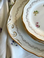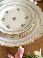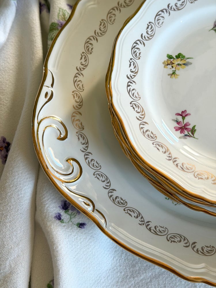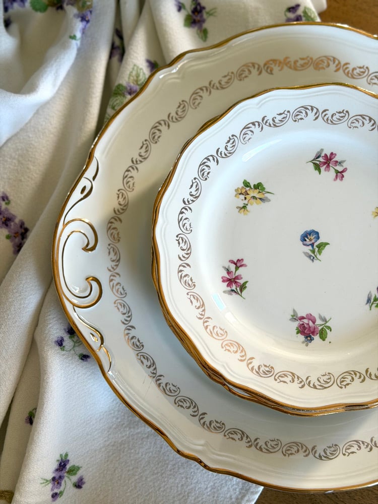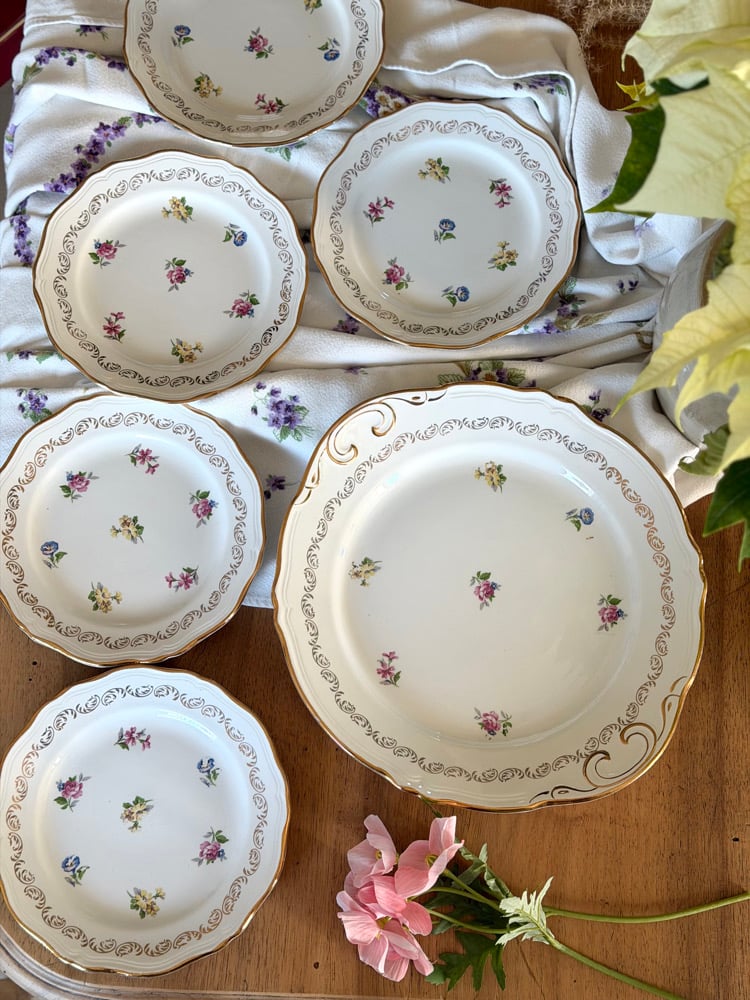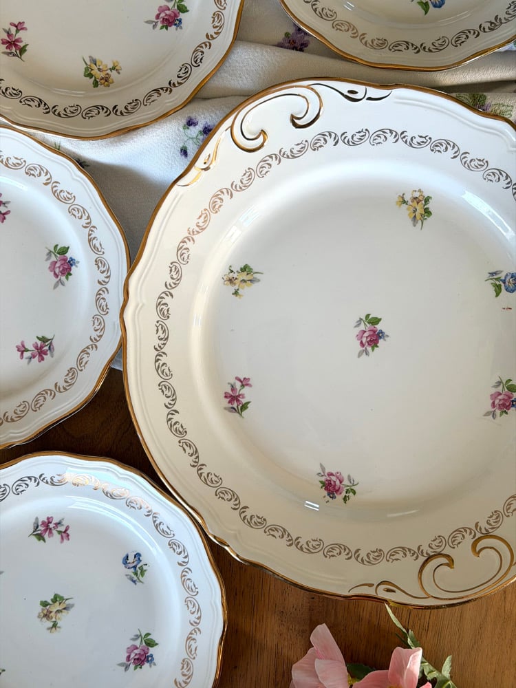 Charmant ensemble de vaisselle ancienne L’amandinoise, composé d’un grand plat de service et de cinq assiettes à dessert. Chaque pièce est décorée de petits bouquets floraux délicats, soulignés par une frise et un liseré doré.