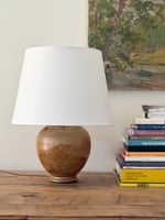 Lampe composée d’un pied en céramique fait main, aux émaux mouchetés dans des tons bruns et crème.