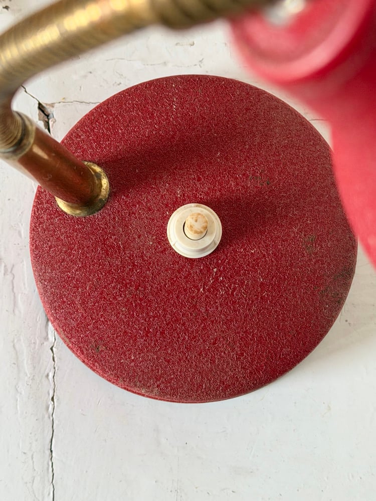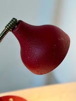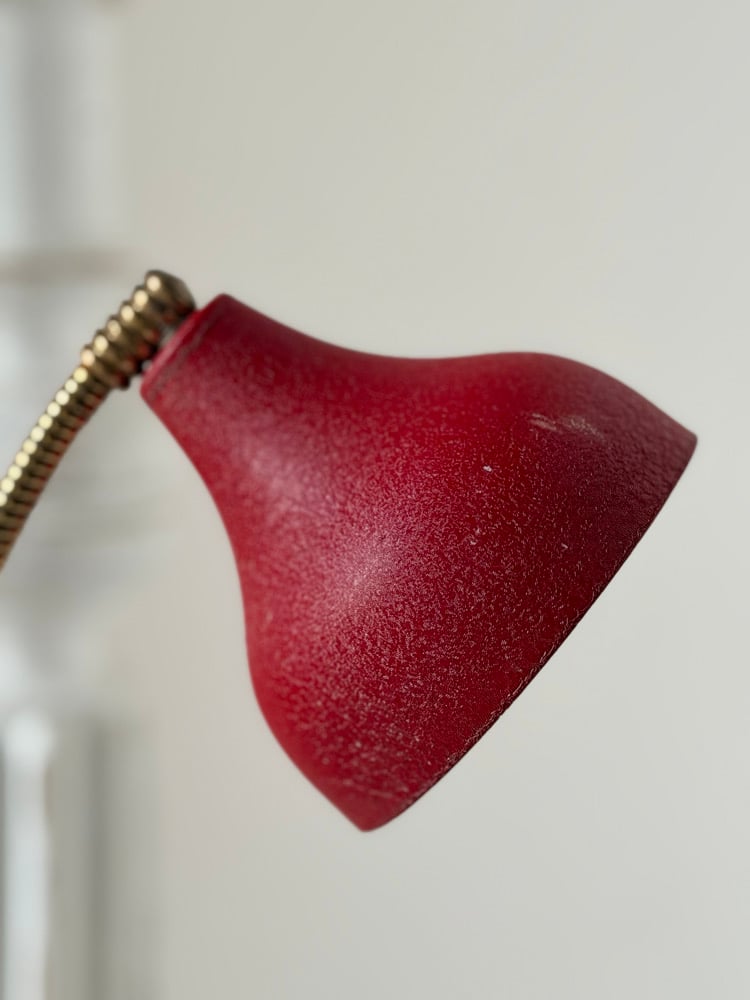Elle présente une peinture rouge d’origine à l’aspect légèrement grainé. Son bras flexible doré permet d’orienter facilement la lumière selon les besoins.