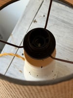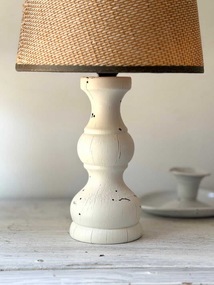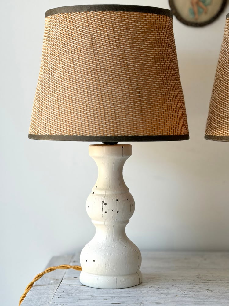 Deux lampes à poser en bois tourné blanc, chacune avec son abat-jour en fibres naturelles.