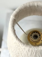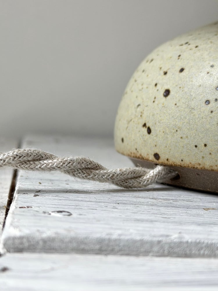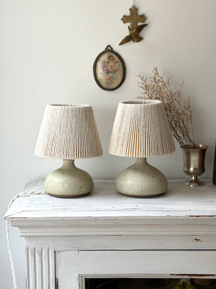 Leurs pieds en grès moucheté, aux formes douces et organiques, s’associent à des abat-jours en corde de coton qui diffusent une lumière chaleureuse et apaisante.