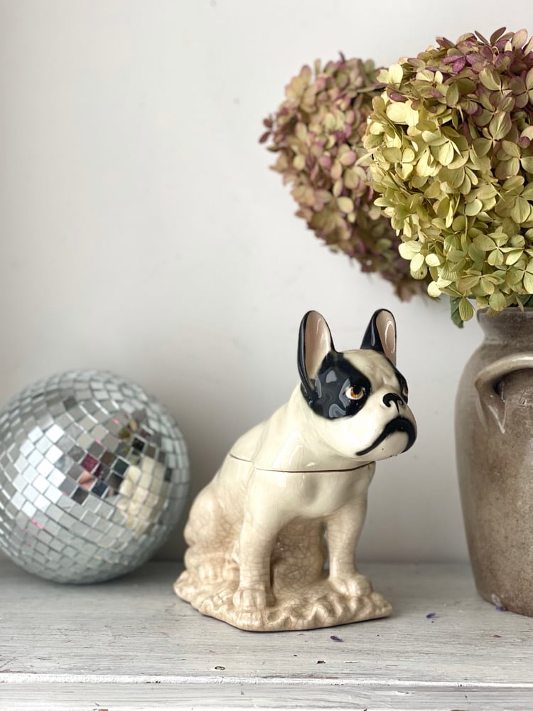 Superbe pot couvert ancien en faïence, représentant un bouledogue assis. La tête amovible forme le couvercle, ajusté sur le corps de l’animal.