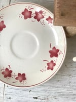 Le décor floral rouge profond sur fond crème, typique du milieu du XXe siècle (1940), incarne parfaitement le style sobre et élégant de la faïence belge.