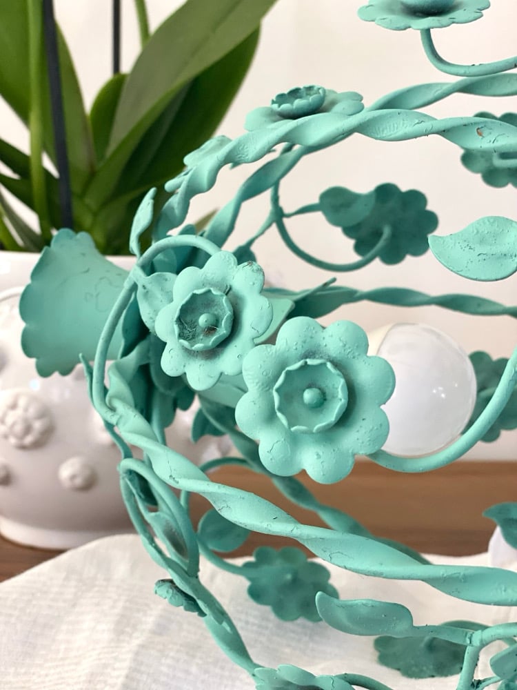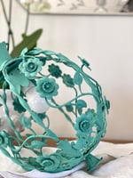 Charmante suspension vintage en métal, travaillée de fleurs et de feuillages en relief. Peinte dans une jolie couleur vert d’eau, elle diffuse une atmosphère joyeuse et originale, parfaite pour donner du caractère à une pièce.