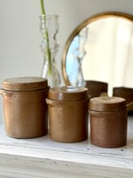 Lot de trois pots anciens en grès émaillé, chacun muni de son couvercle assorti.