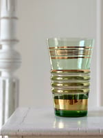 Vase en verre teinté vert, orné de lignes dorées et de reliefs horizontaux.