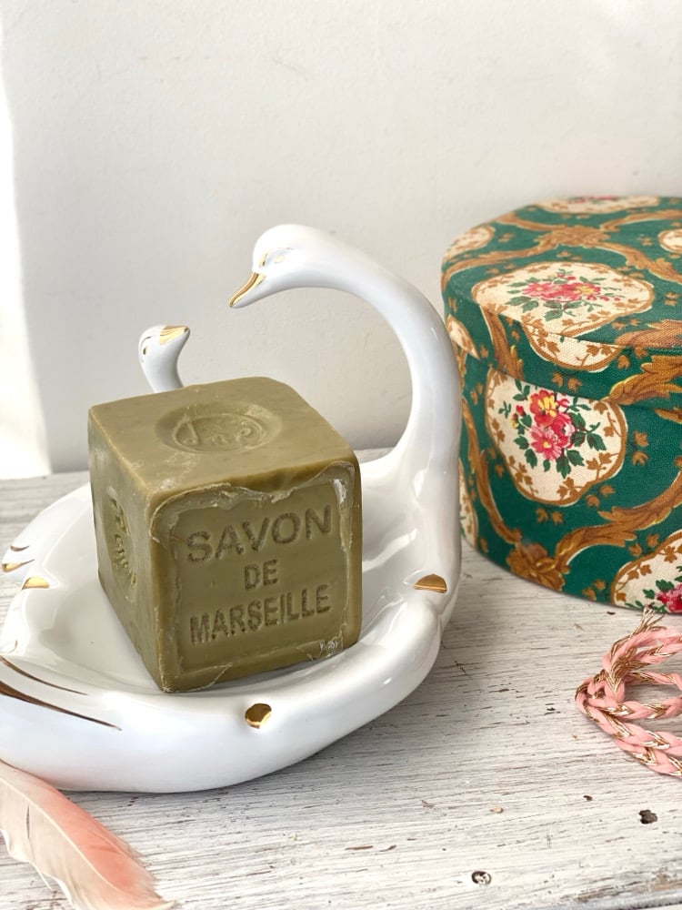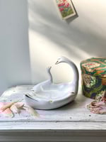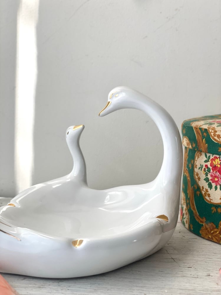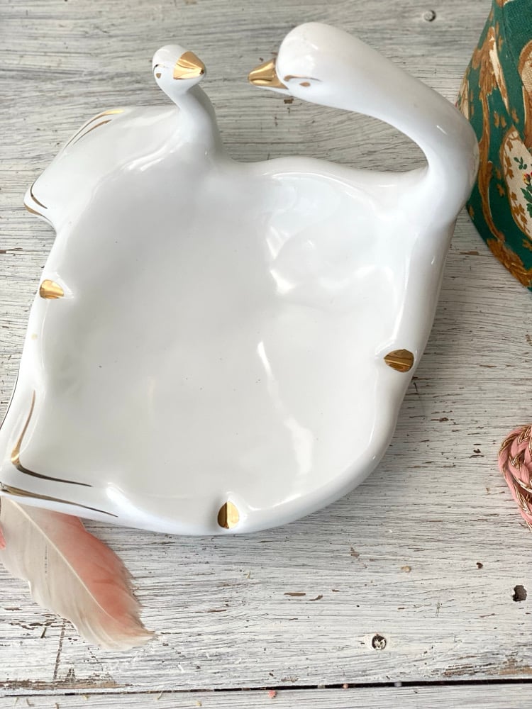 Superbe vide-poches des années 60, en céramique blanche, décoré de deux cygnes stylisés aux finitions dorées.